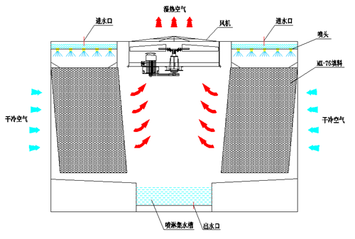 熱源出來的熱水流入冷卻塔的上部散水槽中,受重力作用,通過散水孔均勻地噴灑在填料表面,同時,空氣由冷卻塔兩側的進風格柵進入,橫掠填料,并與噴淋水形成橫流,一小部分水被蒸發,從而帶走熱量,降低水溫。熱濕空氣由頂部的通風機排到周圍大氣中,被冷卻的水則落到集水盤后重新回到熱源。